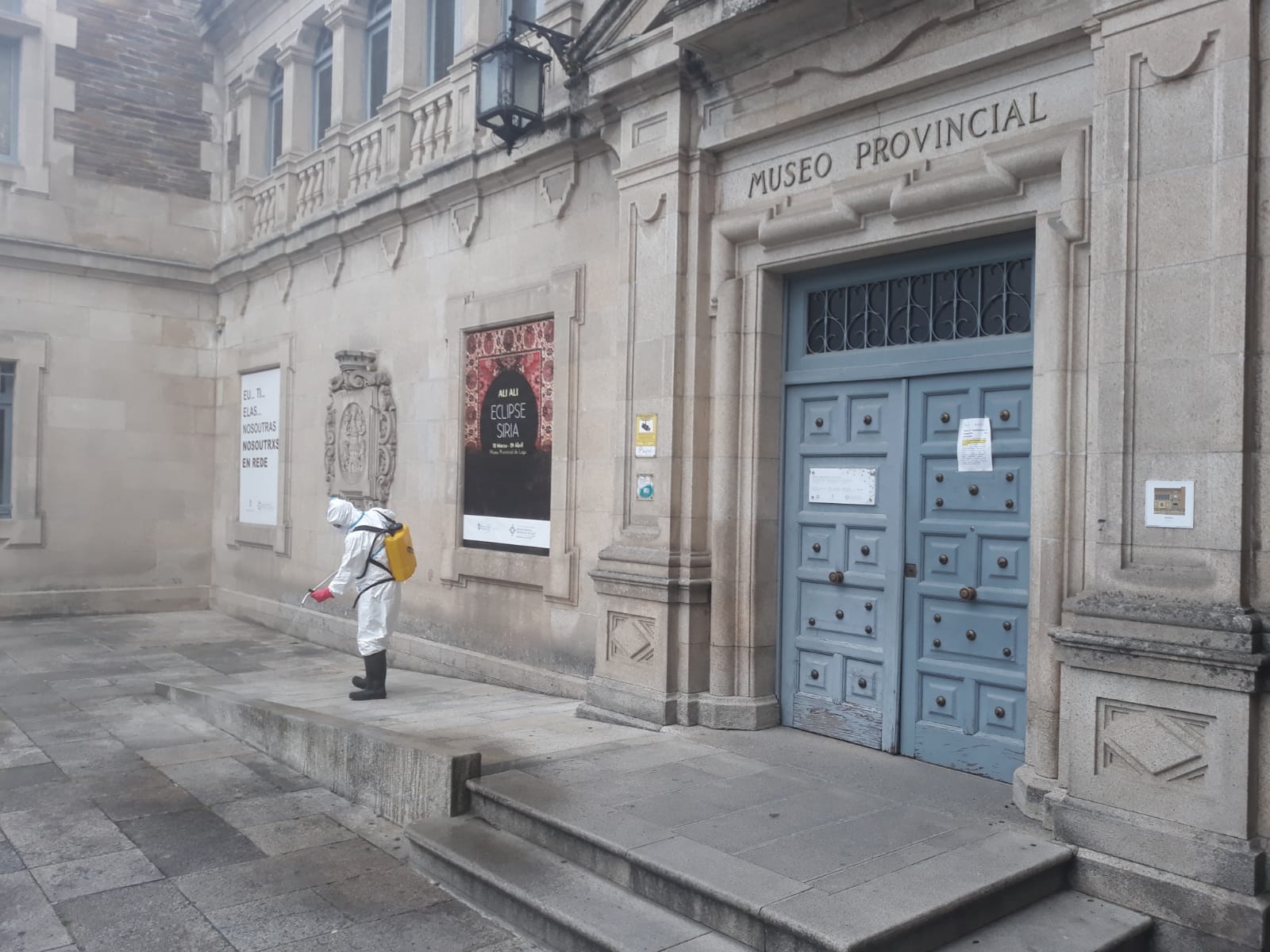 As labores de desinfección xa se efectuaron este mércores no Pazo de San Marcos, no Museo Provincial de Lugo, no Museo do Mar, nas oficinas da Praza de Santo Domingo, no centro de formación audiovisual, na produtora do Servizo de Audiovisuais, nos locais do Parque Móbil e nas dependencias de Recadación. O vindeiro luns acometeranse nos museos de San Paio de Narla e Pazo de Tor, nas dependencias de Vías e Obras, no CENTRAD, no Arquivo e na Unidade de Mantemento.