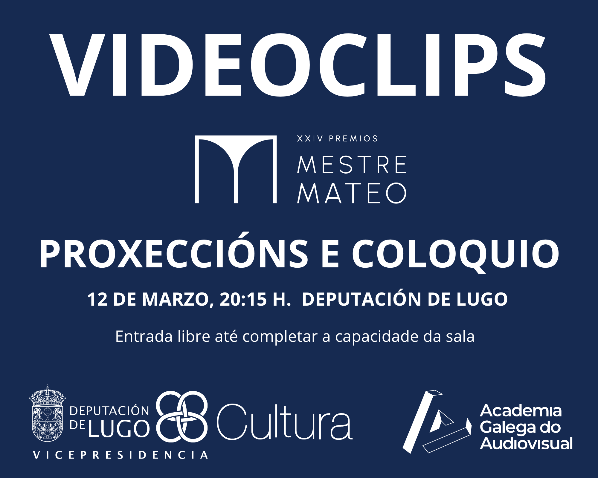 A Vicepresidencia da Deputación de Lugo reunirá a artistas e equipos de realización e produción dos videoclips finalistas ao XXIV Premios Mestre Mateo nunha proxección coloquio que se celebrará o xoves -12 de marzo, ás 20.15 horas- no Pazo de San Marcos en Lugo.