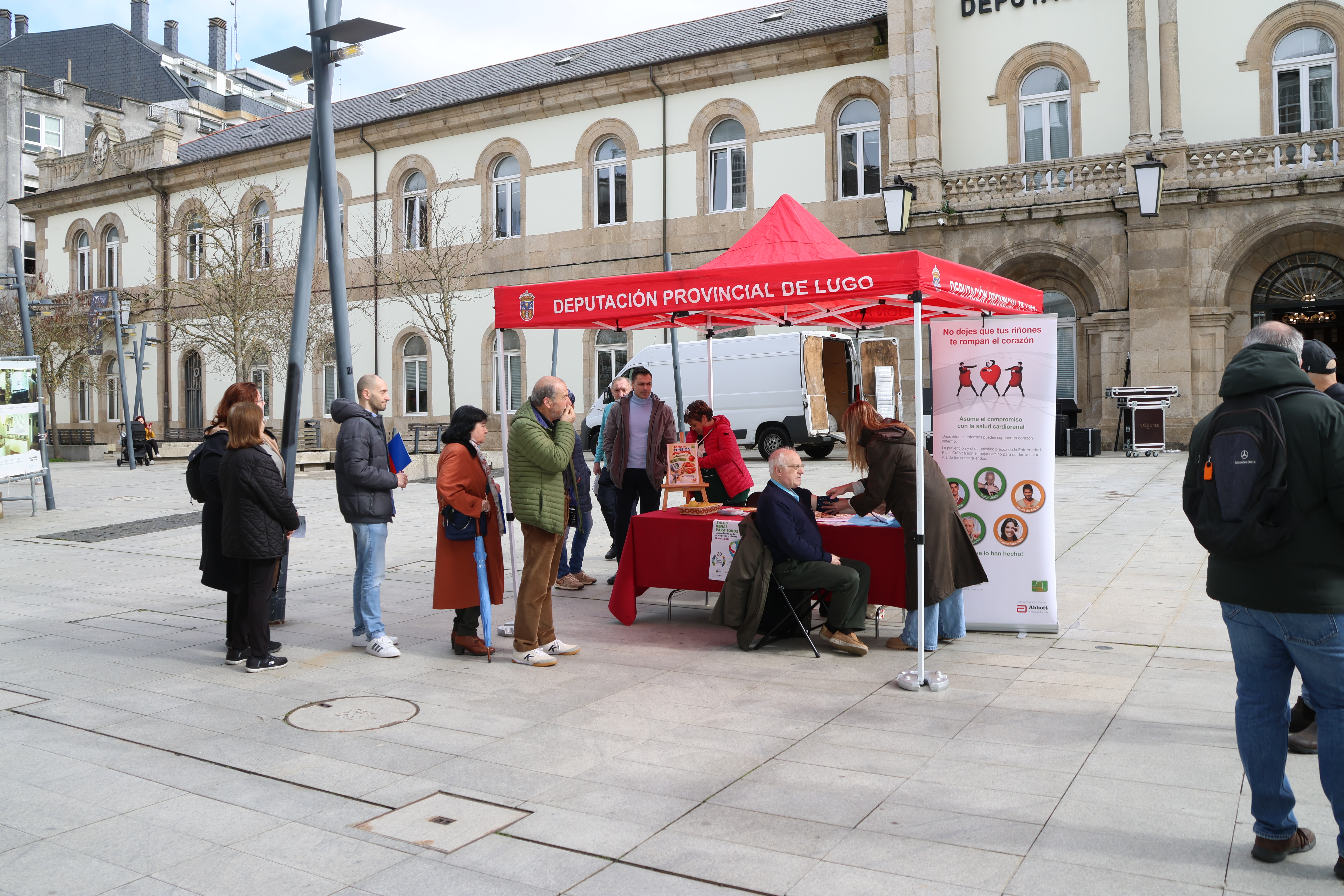 O Deputado de Promoción Económica e Social, Pablo Rivera Capón, visitou este xoves a mesa de cuestación instalada pola Asociación para a Loita Contra as Enfermidades do Ril (ALCER Lugo) diante do Pazo de San Marcos. O Deputado animou a todas as persoas a achegarse nesta xornada ás mesas informativas que o colectivo instalará ao longo da cidade, co obxectivo de concienciar á poboación sobre a importancia da prevención e da detección precoz da enfermidade renal crónica. Valorou tamén o compromiso de ALCER Lugo, que leva máis de 40 anos prestando apoio ás persoas afectadas, e lembrou a colaboración da Deputación mediante unha axuda anual de 6.000 €.