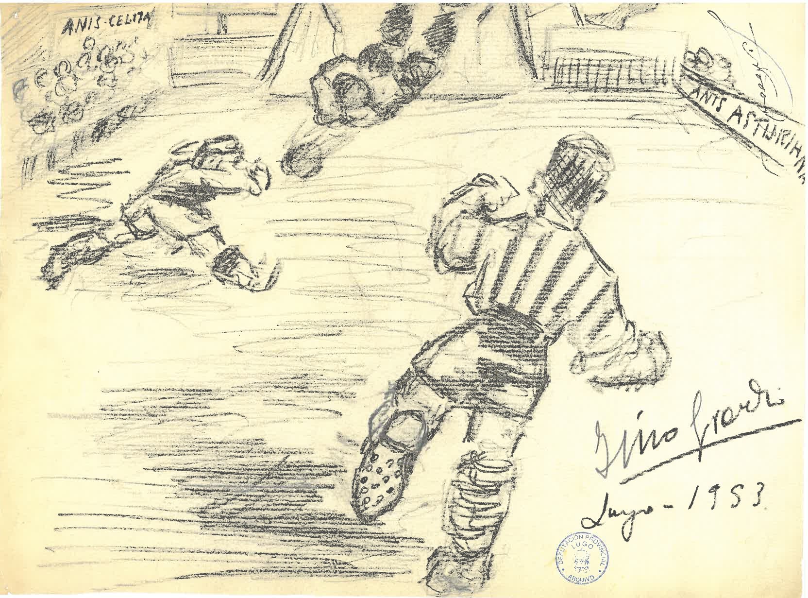 O debuxo, realizado a lapis sobre papel, é de carácter figurativo e temática deportiva, atribuído a Tino Grandío e en xuño de 1953. A composición representa unha escena de fútbol en pleno desenvolvemento do xogo. En primeiro plano apreciase un xogador de costas, captado en actitude de avance, co corpo inclinado cara adiante, mentres que a portería ocupa unha posición central, organizando a estrutura da imaxe.