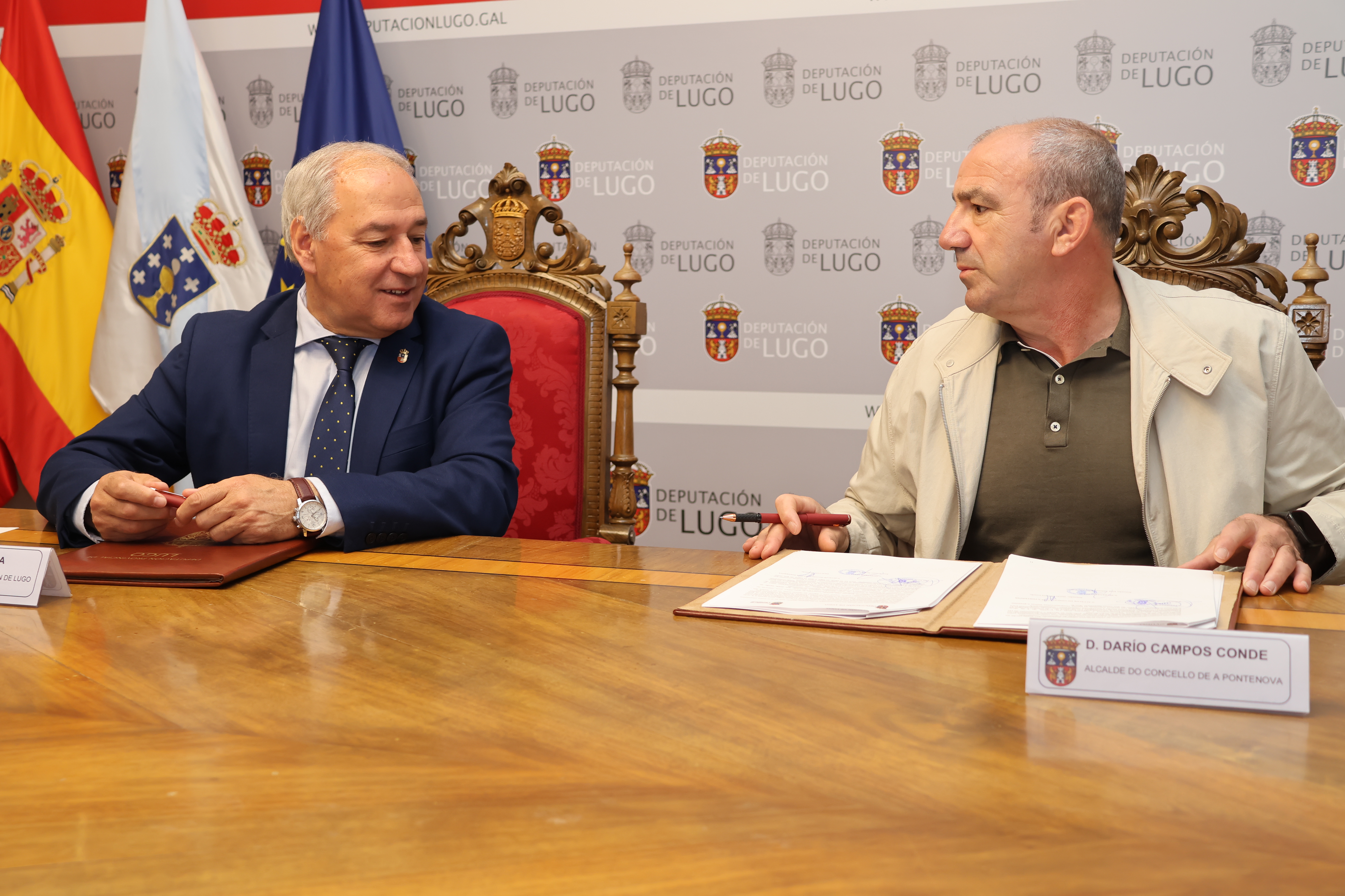 O presidente da Deputación de Lugo, José Tomé Roca, e o Alcalde do Concello da Pontenova, Darío Campos Conde, veñen de asinar un convenio de colaboración na Sala de Xuntas do Pazo de San Marcos mediante o que a institución provincial realiza unha achega económica de 137.151€ a este municipio para acondicionar a rede viaria da parroquia de Santa María de Conforto.