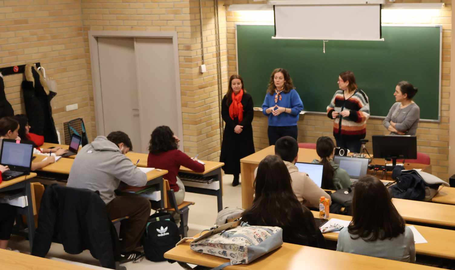 Iria Castro e Cristina López participaron nunha clase con estudantes de materias relacionadas coas industrias culturais e os medios audiovisuais, cos que compartiron as implicacións da colaboración coa Academia Galega do Audiovisual para a organización da gala que se celebrará o vindeiro 21 de marzo no Auditorio Fuxan Os Ventos.