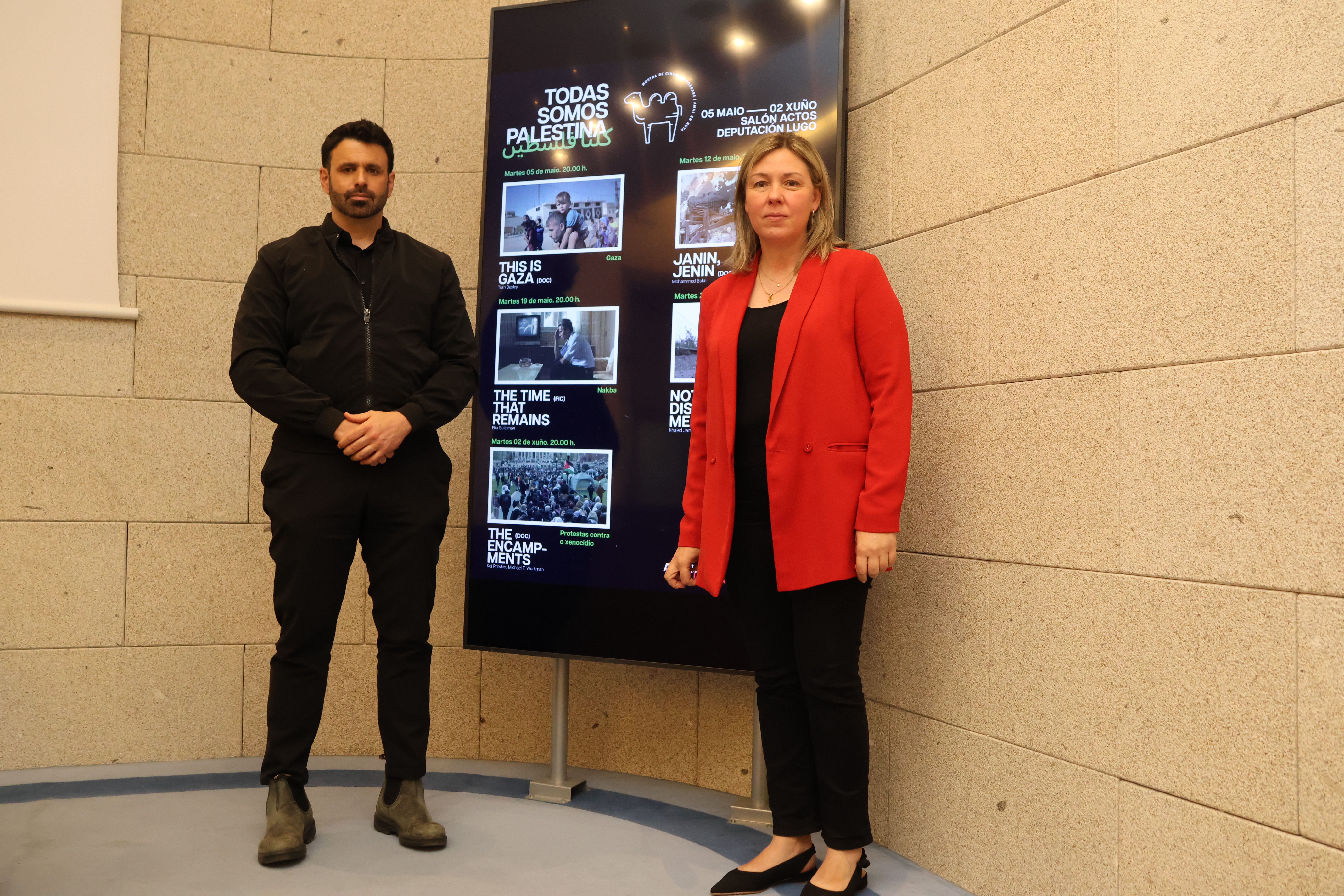 A Deputada de Réxime Interior, Promoción do Territorio e Turismo, Pilar García Porto, e o presidente da Fundación Araguaney-Puente de Culturas, Ghaleb Jaber Martínez, presentaron este xoves no Salón de Actos do Pazo de San Marcos o ciclo de cinema euroárabe AMAL en Ruta Lugo 2026, que se desenvolverá na sede provincial entre os meses de maio e xuño e, que nesta nova edición, estará centrado na situación do pobo palestino.