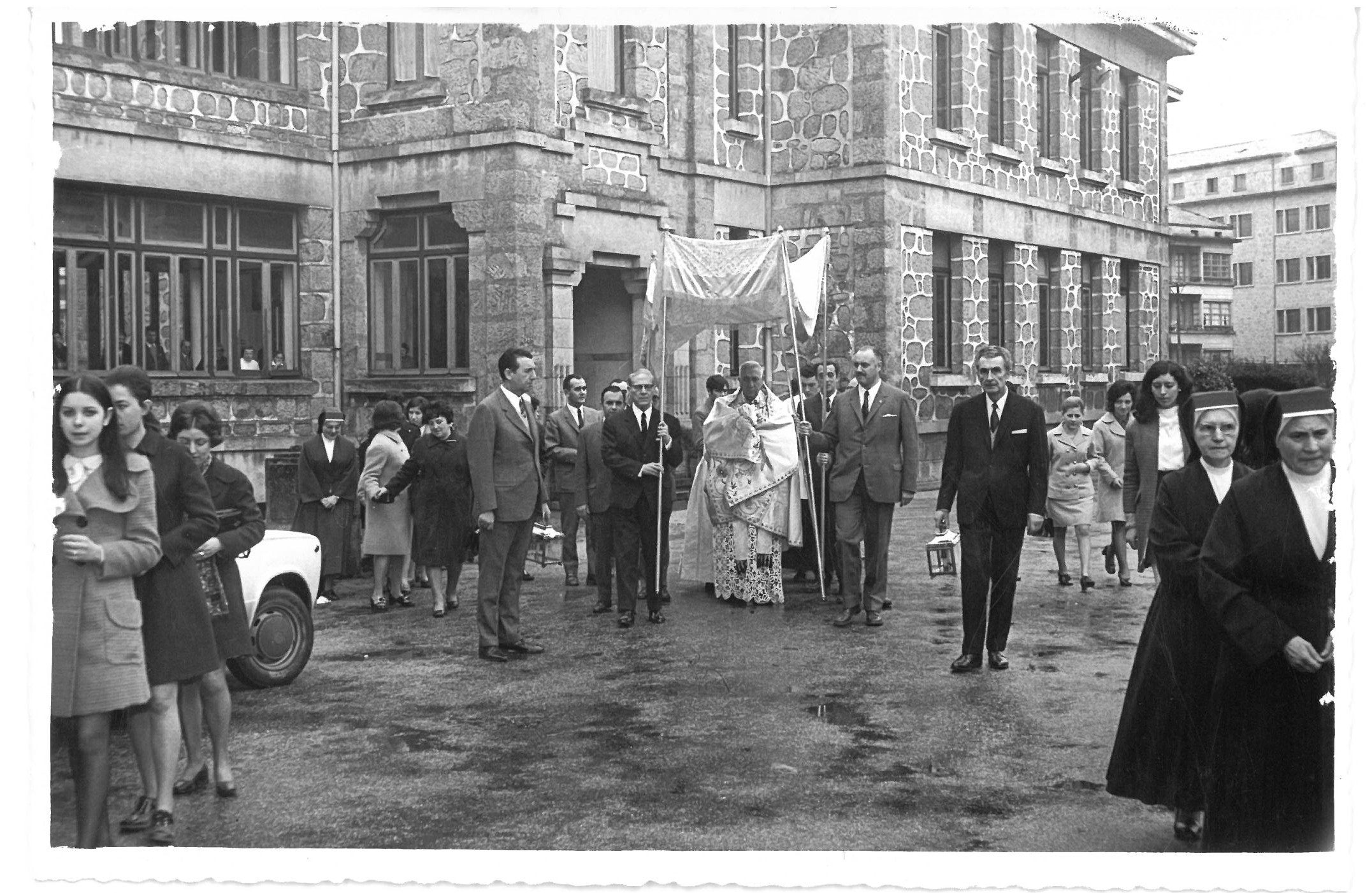 Hospital de San Xosé: Ofrenda. Baixo palio o bispo Ona de Echave e cara adiante á esquerda o Presidente de la Torre Moreiras. Ca. 1965-1970 sin.3330.12 ADPL